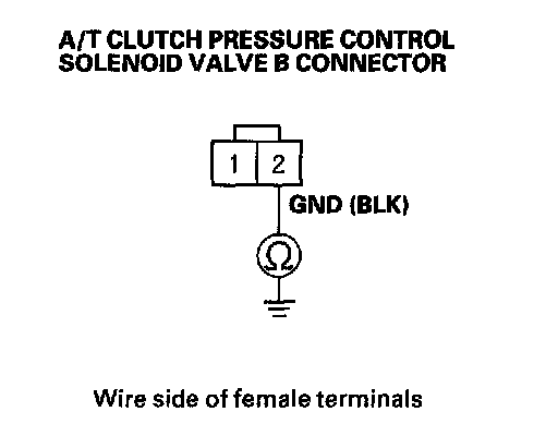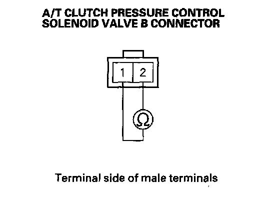 10. Measure the resistance between A/T clutch pressure control solenoid valve B connector terminals No. 1 and No. 2.