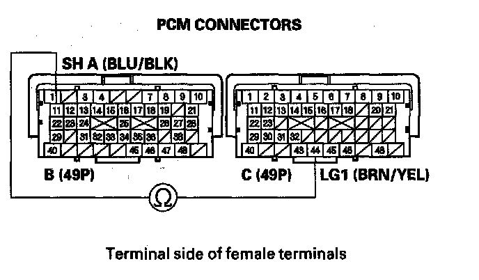 11. Measure the resistance between PCM connector terminals B11 and C44.