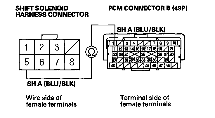 15. Check for continuity between shift solenoid harness connector terminal No. 5 and the shift solenoid valve A connector terminal.
