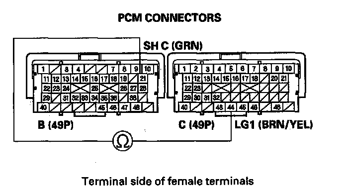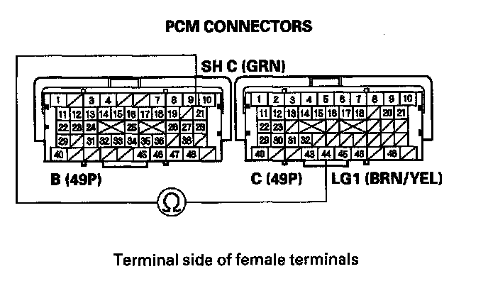 11. Measure the resistance between PCM connector terminals B21 and C44.