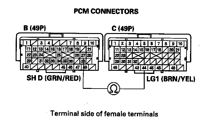 11. Measure the resistance between PCM connector terminals B27 and C44.