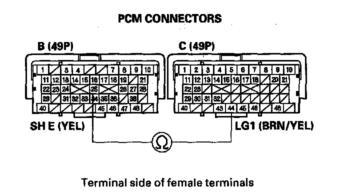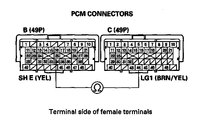 11. Measure the resistance between PCM connector terminals B25 and C44.