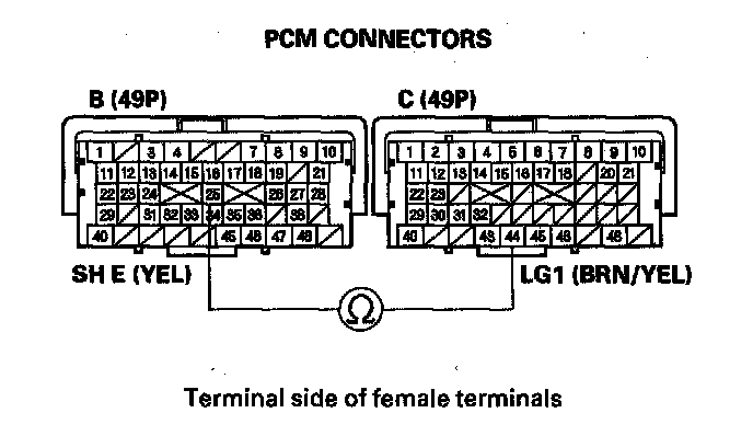 11. Measure the resistance between PCM connector terminals B25 and C44.
