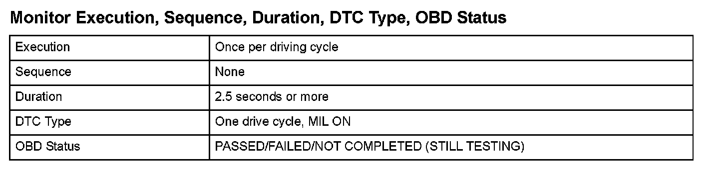 Monitor Execution, Sequence, Duration, DTC Type, OBD Status