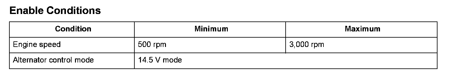 The alternator is driven by the engine, and it generates electricity to supply the necessary power to the electrical load and to charge the battery. The alternator voltage target values of 14.5 V and 12.5 V are achieved by switching the alternator control mode (controlled by the engine control module (ECM)/powertrain control module (PCM)). The alternator output signal is sent to the ECM/PCM, and it varies according to the battery's state of charge, the electrical load, and the engine speed. When the engine speed is a specified value, the IGP terminal voltage is below a set value when the alternator is in the 14.5 V mode, and the alternator power generation amount is a set range or less, and this condition continues more than a set time, the ECM/PCM detects a malfunction and a DTC is stored.