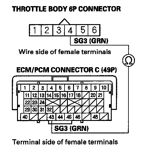 17. Check for continuity between ECM/PCM connector terminals C43 and throttle body 6P connector terminal No. 4.