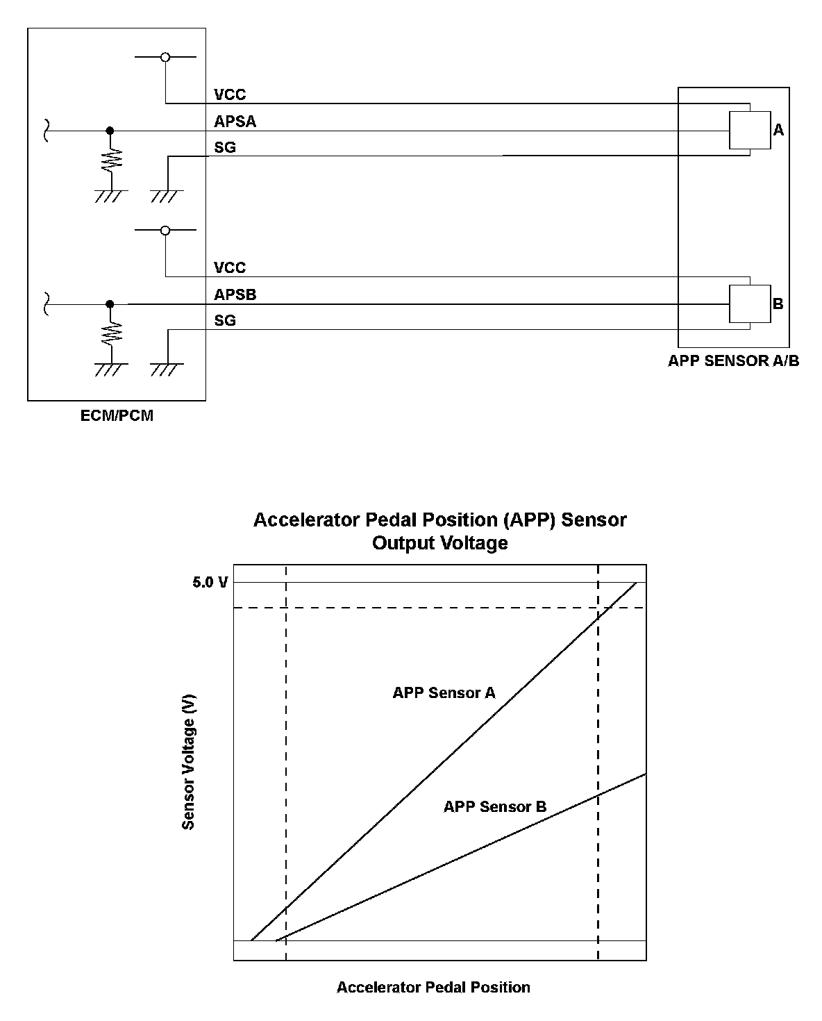 Accelerator pedal position (APP) sensor A and accelerator pedal position (APP) sensor B are potentiometers, and they are attached on the accelerator pedal. When the driver presses the accelerator pedal, the APP sensors A and B reacts and detects the accelerator opening value. The accelerator pedal opening value is converted to a signal in APP sensors A and B and transmitted to the engine control module (ECM)/powertrain control module (PCM) to compute the target position. The target position signal is then transmitted to the throttle actuator control module. APP sensor A is for the primary control, and APP sensor B is a back-up of APP sensor A in case it malfunctions. Both sensors compare their output voltage to each other for malfunction detection. When the voltage difference of APP sensor B is out of a fixed range for a set time, the ECM/PCM detects a malfunction, and a DTC is stored.