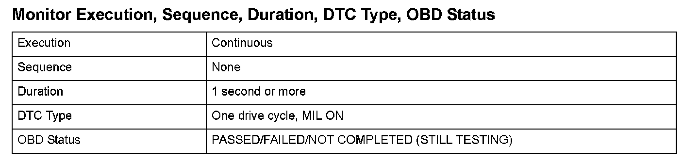 Monitor Execution, Sequence, Duration, DTC Type, OBD Status