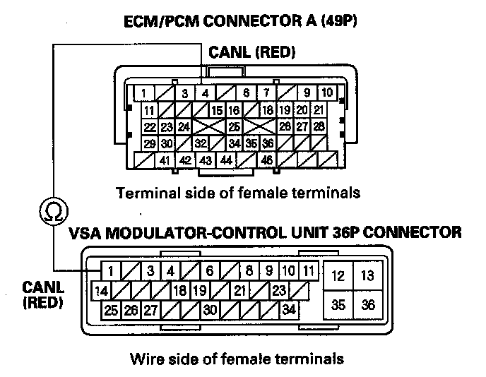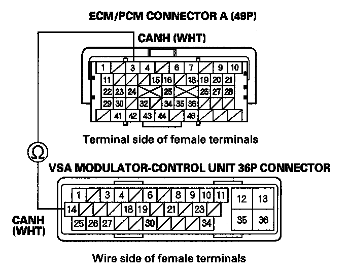10. Check for continuity between ECM/PCM connector terminal A3 and VSA modulator-control unit 36P connector terminal No. 14.