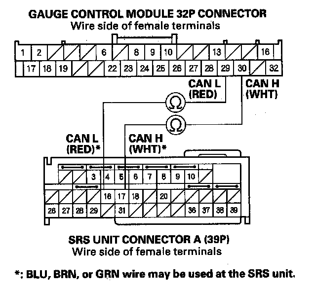 9. Check for continuity between the gauge control module 32P connector No. 29 and No. 30 terminals and the SRS unit connector A (39P) No. 16 and No. 17 terminals respectively.