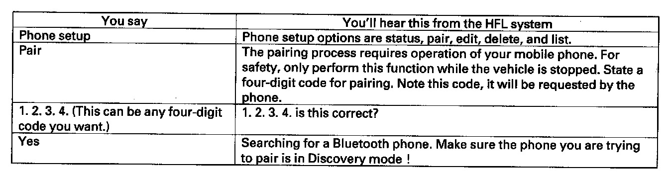 4. When prompted, enter the four-digit PIN that you entered from step 2 into the phone. You will hear the HFL system say "A new phone has been found. Would you like to name this phone"?
