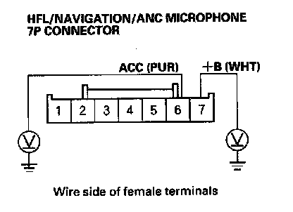 2. Measure the voltage between the HFL/navigation/ANC microphone connector terminals No. 6 and No. 7 individually.