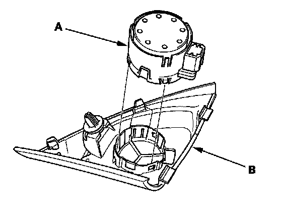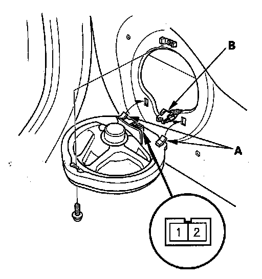 3. If the resistance is not as specified, replace the front door tweeter. Remove the front door tweeter (A) from front door tweeter cover (B).