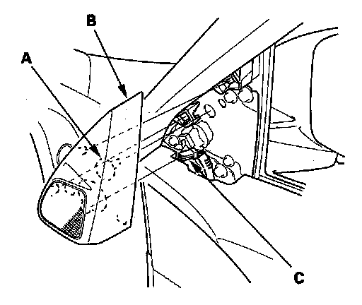 1. Detach the clip (A) and remove the front door tweeter cover (B). Then disconnect the connector (C).