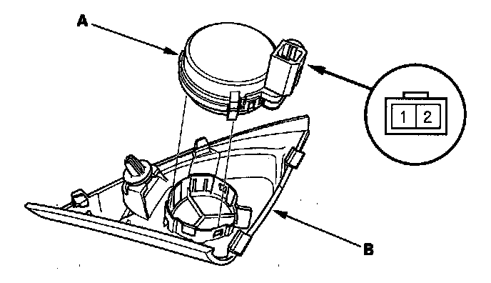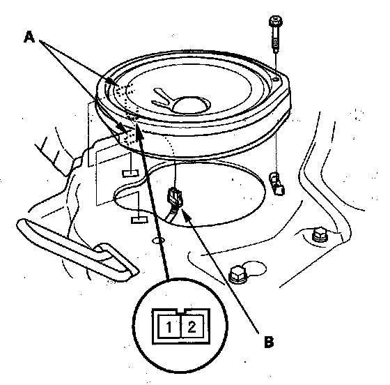 3. Measure the resistance between the front door tweeter (A) terminal No. 2 and the outside terminal of the capacitor. There should be about 4 ohms.