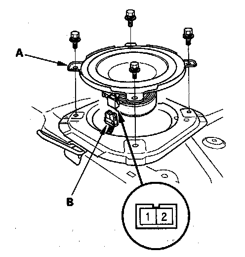 2. Remove the bolt. Then lift the speaker straight up to release the lower clips (A).