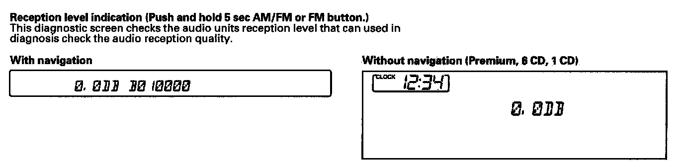 To check FM reception, press and hold the AM/FM button for 5 seconds, then release. To check the AM band, press and hold the AM/FM button for another five seconds, then release. The reception level is displayed in decibels (db). You can check the reception with or without the amplifier. Press the A. SEL button to toggle between turning the amplifier on and off. The amplifier is on when the letter A appears next to the db indication. You can change the station with the tuner button to check the reception level of any specific radio station. Compare this value with a known-good vehicle to check the audio unit reception.