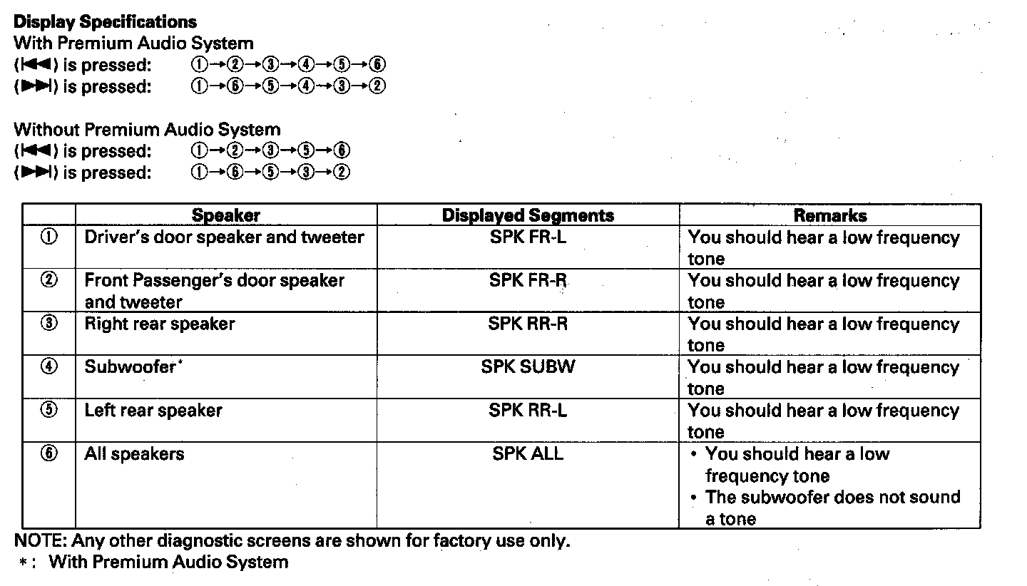 4. The speaker check mode ends when you turn the audio unit off or turn the ignition switch to LOCK (0).