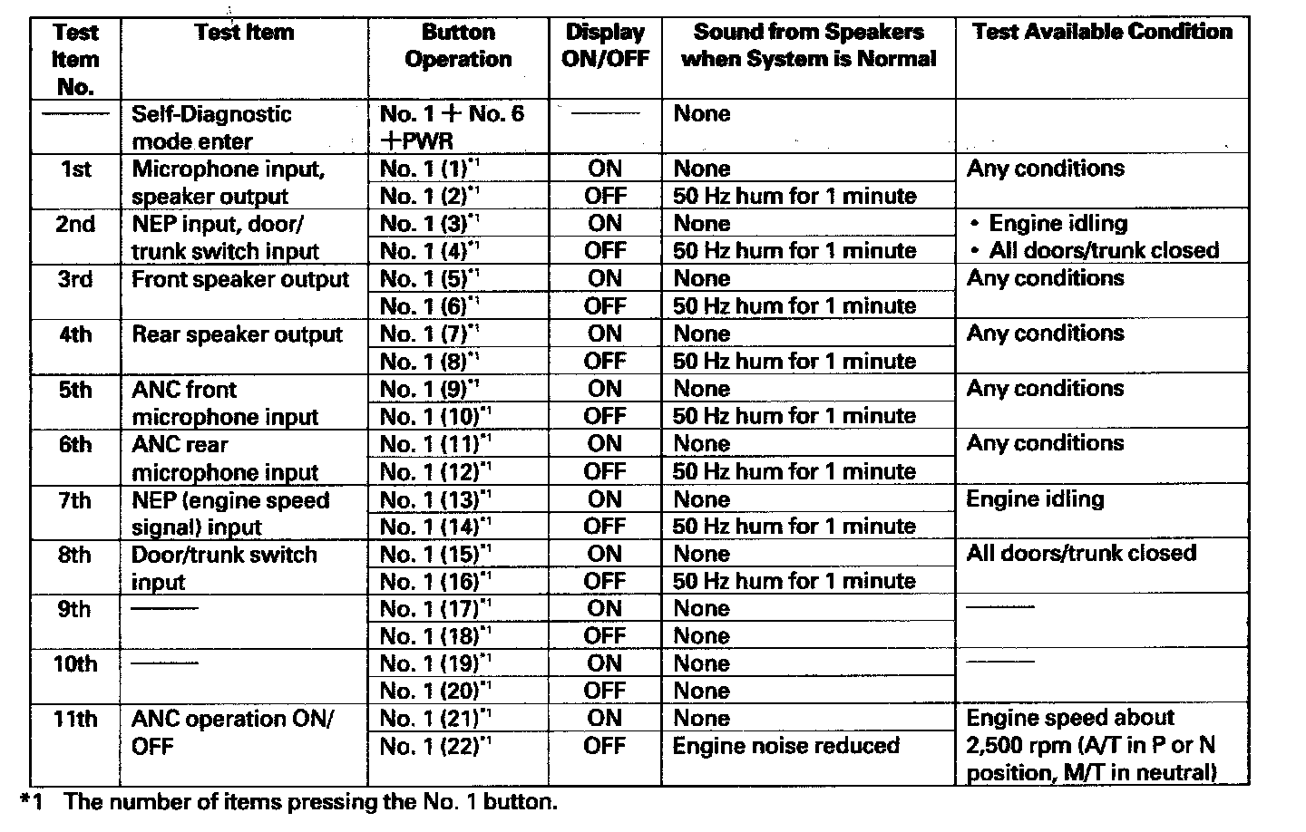 - For test items 1st to 10th, the speaker will make a low-frequency hum (50 Hz) when the system is normal for more than 5 seconds up to 1 minute.