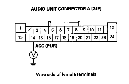 5. Measure the voltage between the No. 14 terminal of audio unit connector A (24P) and body ground.