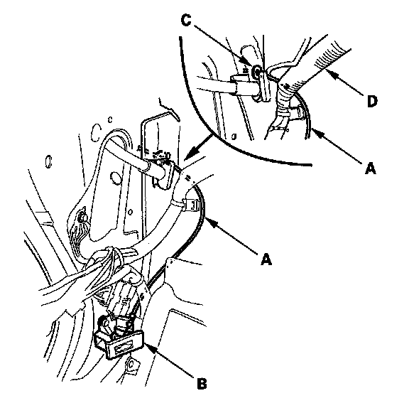 - When installing the opener cable under the dashboard, route the cable under the left engine compartment wire harness (D).