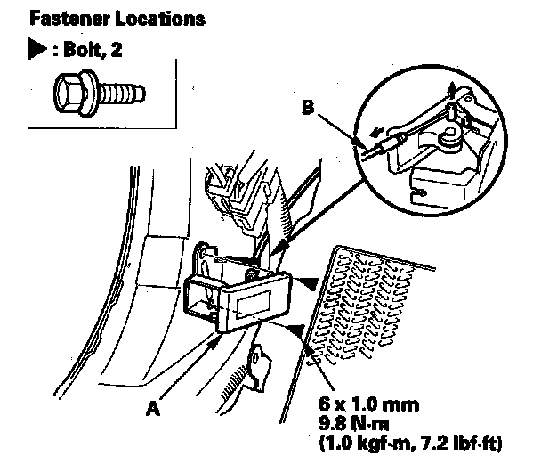 3. Disconnect the hood opener cable (B) from the hood release handle. Take care not to kink the cable.