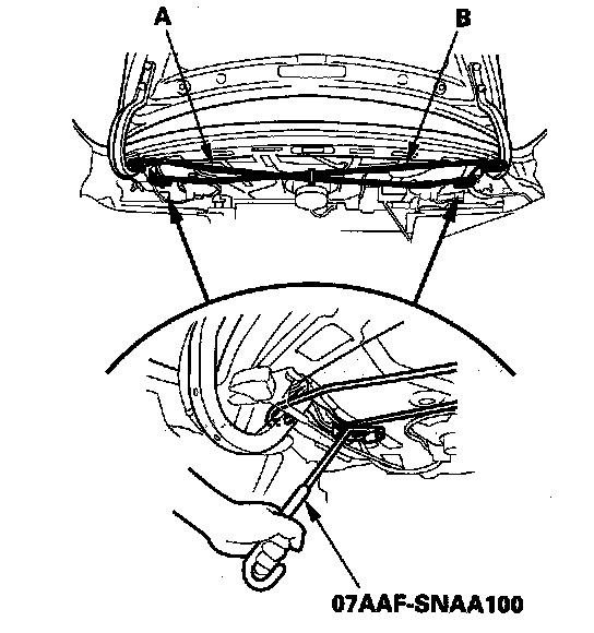2. Put on gloves to protect your hands. Remove the torsion bars with the torsion bar assembly tool from both trunk lid hinges. First remove the left torsion bar (A), then remove the right torsion bar (B).