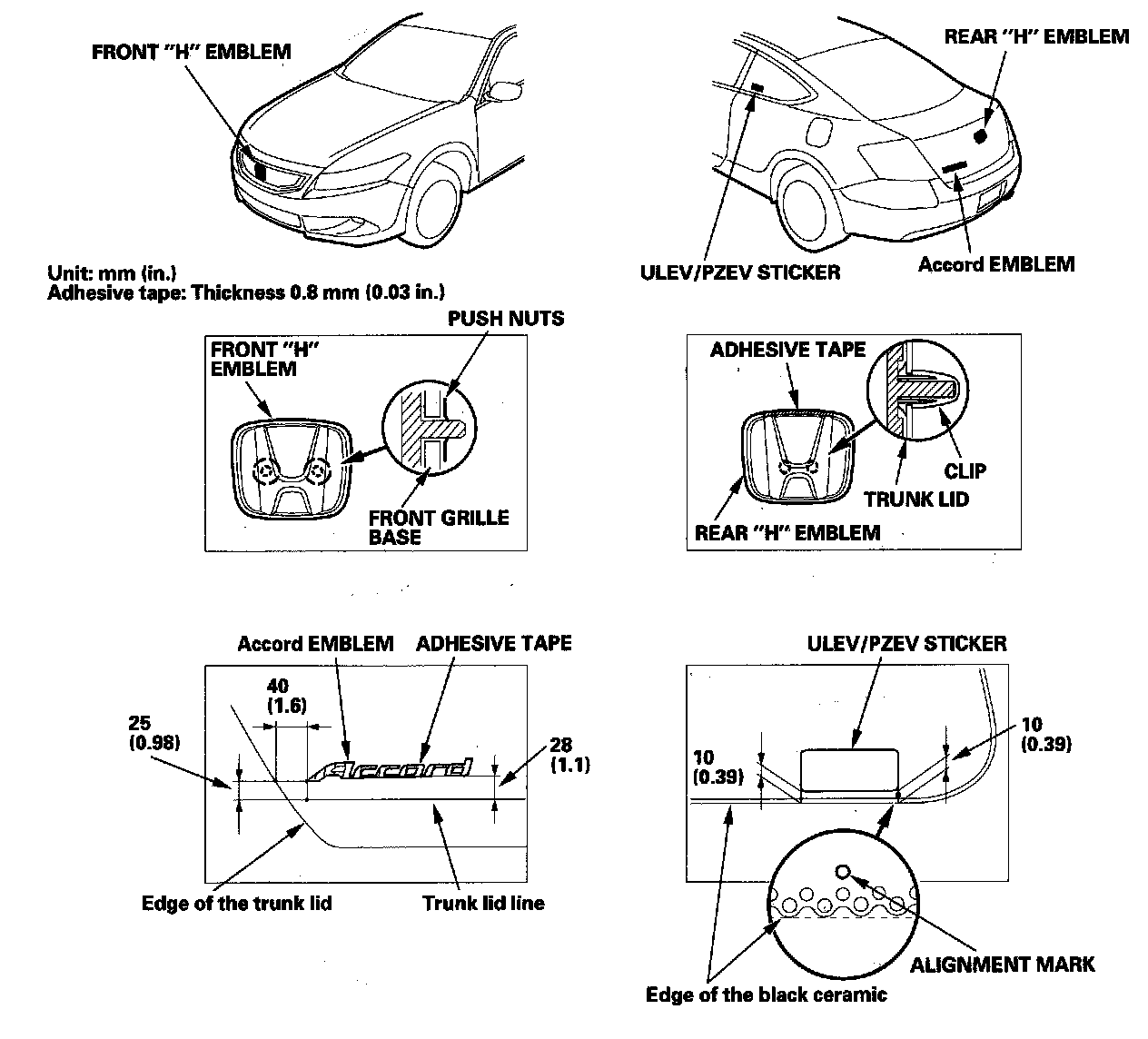 3. Apply the emblems/sticker where shown. When installing the ULEV/PZEV sticker on the inside surface of the left quarter glass, align the sticker with the edge of the black ceramic as shown, then press the sticker into place, and remove the application tape.