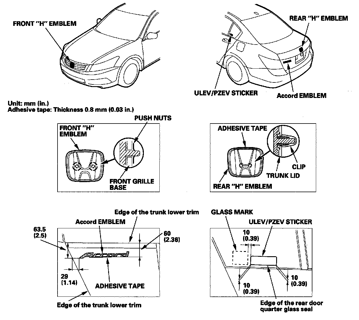 3. Apply the emblems/sticker where shown. When installing the ULEV/PZEV sticker on the inside surface of the left rear door quarter glass, align the sticker with the edge of the glass mark and the rear door quarter glass seal as shown, then press the sticker into place, and remove the application tape.