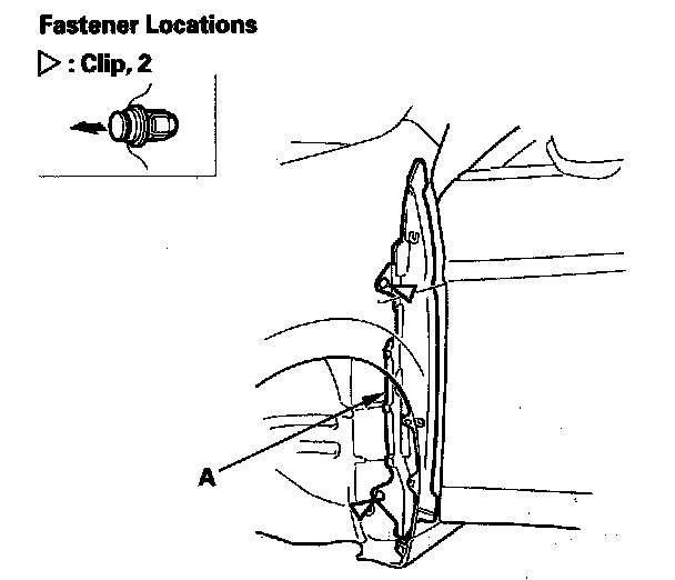 2. From the wheel arch, release the clips fastening the front fender fairing (A).