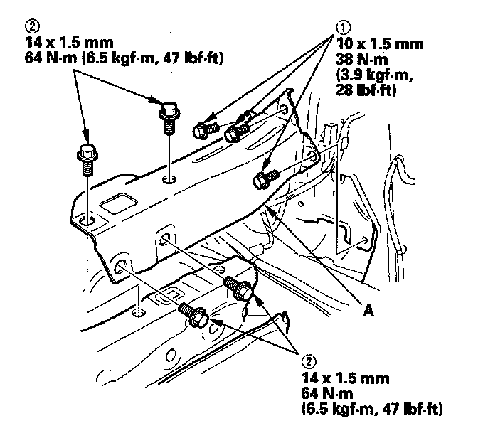 3. Remove the bolts (A, B), then remove the middle cross-member gusset (C).