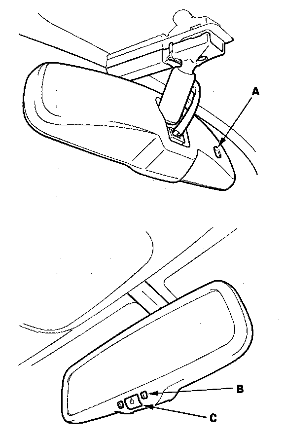 The automatic dimming inside mirror has a front-facing lux level sensor (A), rear-facing lux level sensors (B), and a control unit. The control unit receives signals from each sensor. Based on the difference between the two lux levels (the light outside the vehicle and the light from the headlights of the other vehicle, etc.), the control unit controls the electro-chromic gel to reduce the glare. This dimming function is canceled when the transmission is in reverse, or when the automatic dimming off switch (C) is turned OFF.