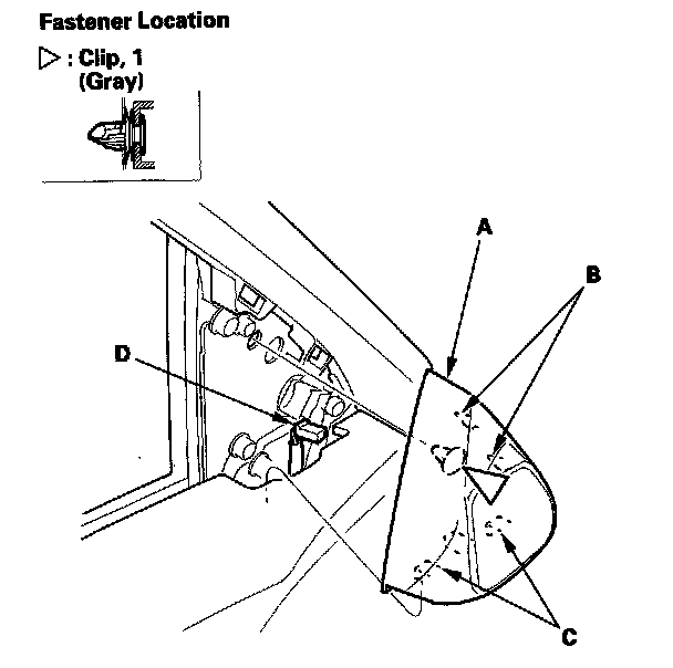 2. With your hand, carefully pull the top edge of the door tweeter cover (A) out to detach the upper hooks (B) and the clip, and remove the cover by lifting it upward to release the bottom hooks (C). Disconnect the door tweeter connector (D).