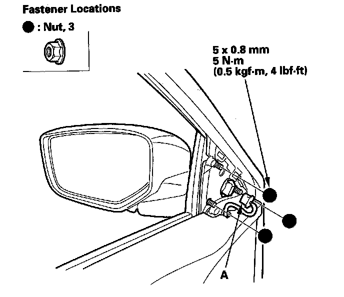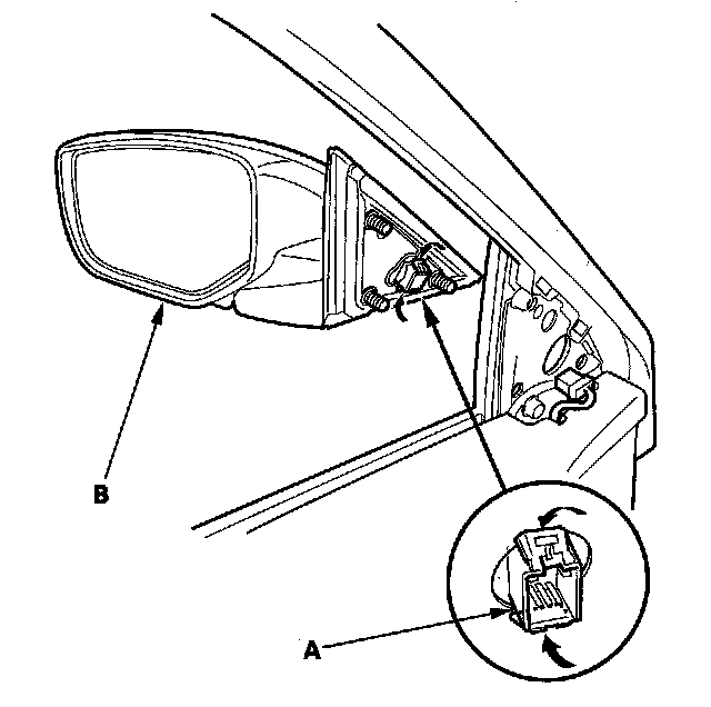 5. While holding the mirror, push in on the connector clip (A), then push out to remove the mirror (B). Take care not to scratch the door.