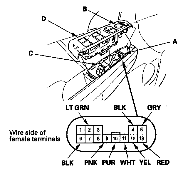 2. Disconnect the 13P connector (A) from the power mirror switch (B) and 37P connector (C) from the power window master switch (D).