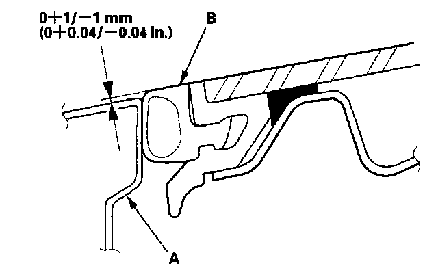 Glass Position AdjustmentThe roof panel (A) should be even with the glass weatherstrip (B), to within 0+1/-1 mm (0+0.04/-0.04 in.) all the way around. If not, make the following adjustment: