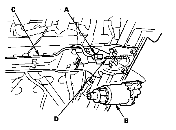 3. Disconnect the slide motor connector (A), then remove the slide motor (B) from the slide motor bracket (C) while disconnecting the motor from the short flex cable (D).