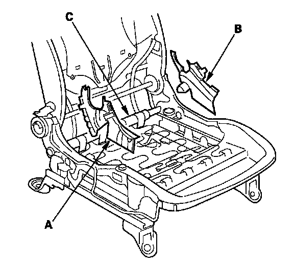3. Remove the recline inner cover (A) and the center inner cover (B) from the seat frame (C).