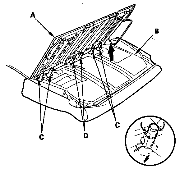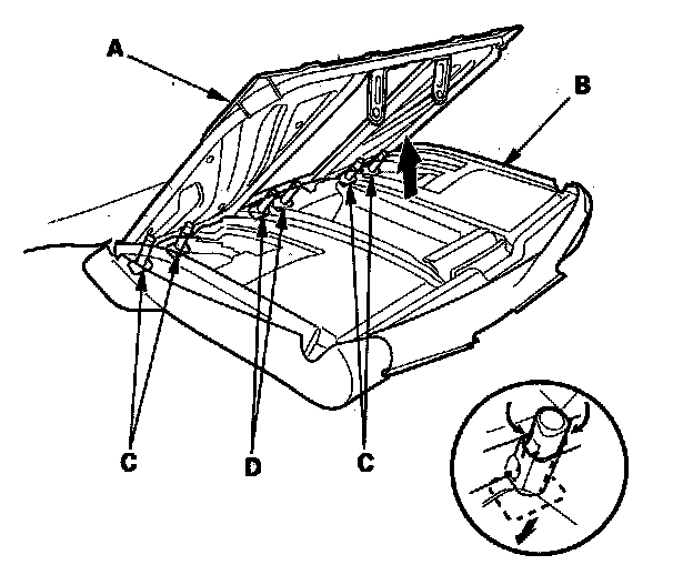 6. Pull out the seat-back frame (A) from the pad (B), then pull out the head restraint guides (C) and the center head restraint guides (D) while pinching the end of the guides, and remove them.