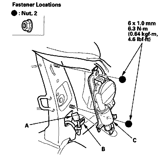 8. Disconnect the lumbar support motor connector (A), and detach the harness clip (B). Remove the nuts, then remove the lumbar support motor (C).