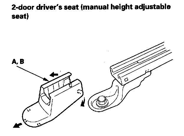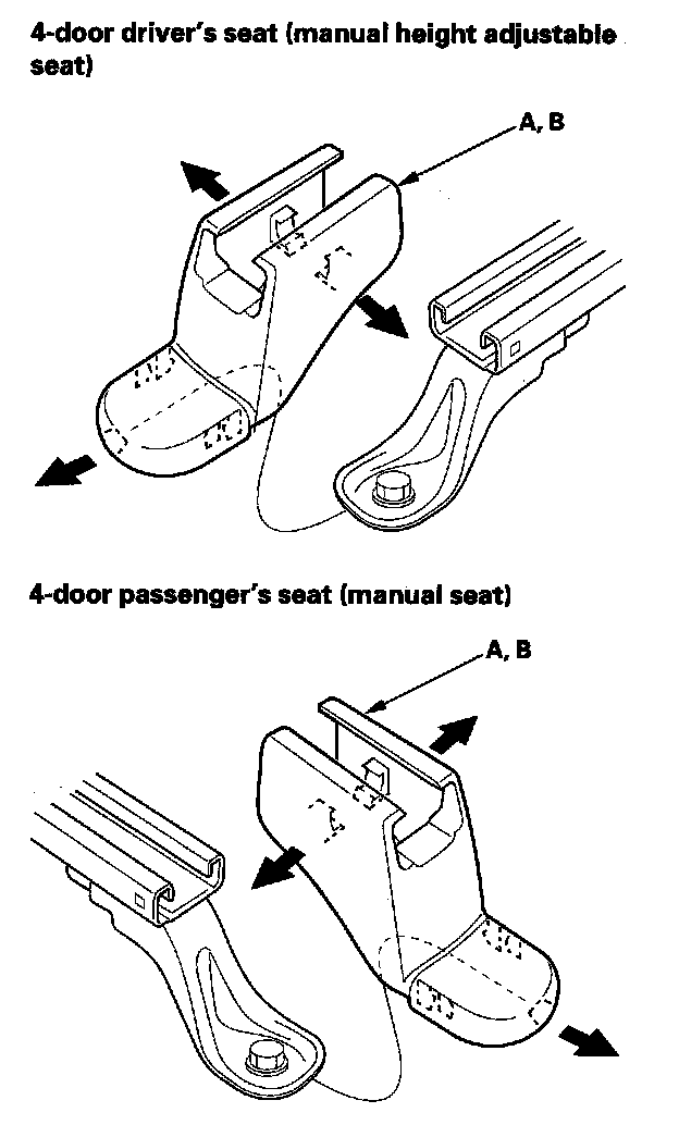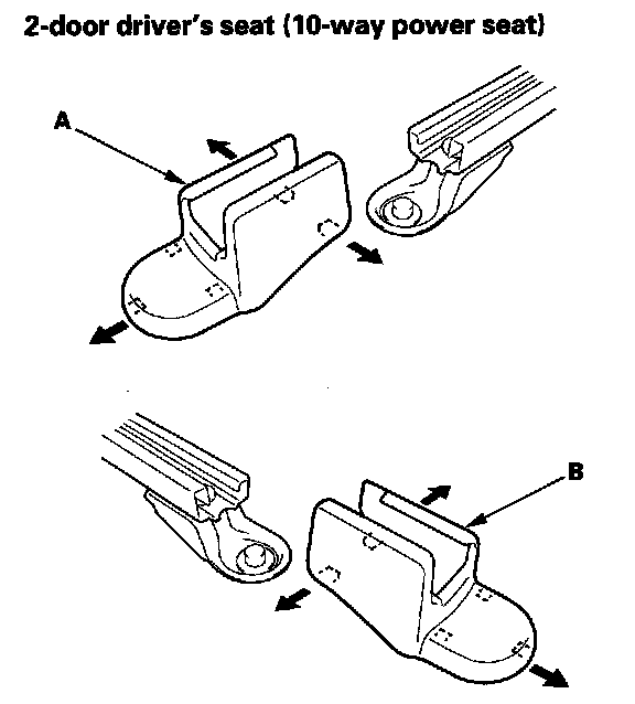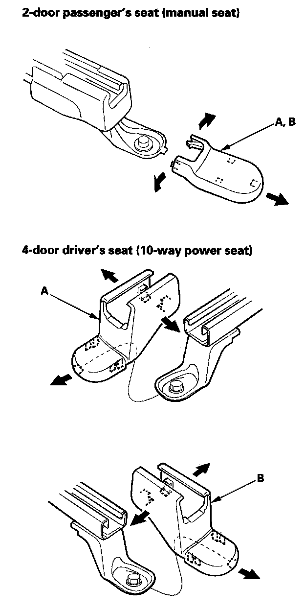 5. Slide the front seat all the way forward, and remove the seat track outer end covers (A) and the seat track inner end covers (B) from the back of both seat tracks.