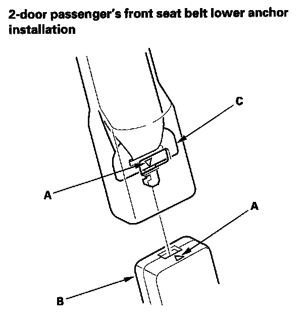 2. 2-door passenger's seat: Carefully insert the tip of a small screwdriver (A) through the hole in the back of the front seat belt lower anchor cover (B) and into the hole in the front seat belt lower anchor (C). Unlock the lower anchor by pushing in on the screwdriver. Remove the screwdriver, and then detach the front seat belt anchor plate (D) and the anchor cover from the lower anchor.