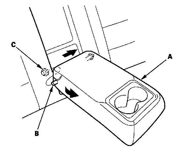 2. Slide the armrest (A) toward the driver's side of the vehicle, and remove the pivot shaft (B) from the collar (C) on the right side of the vehicle by pulling back on the armrest.