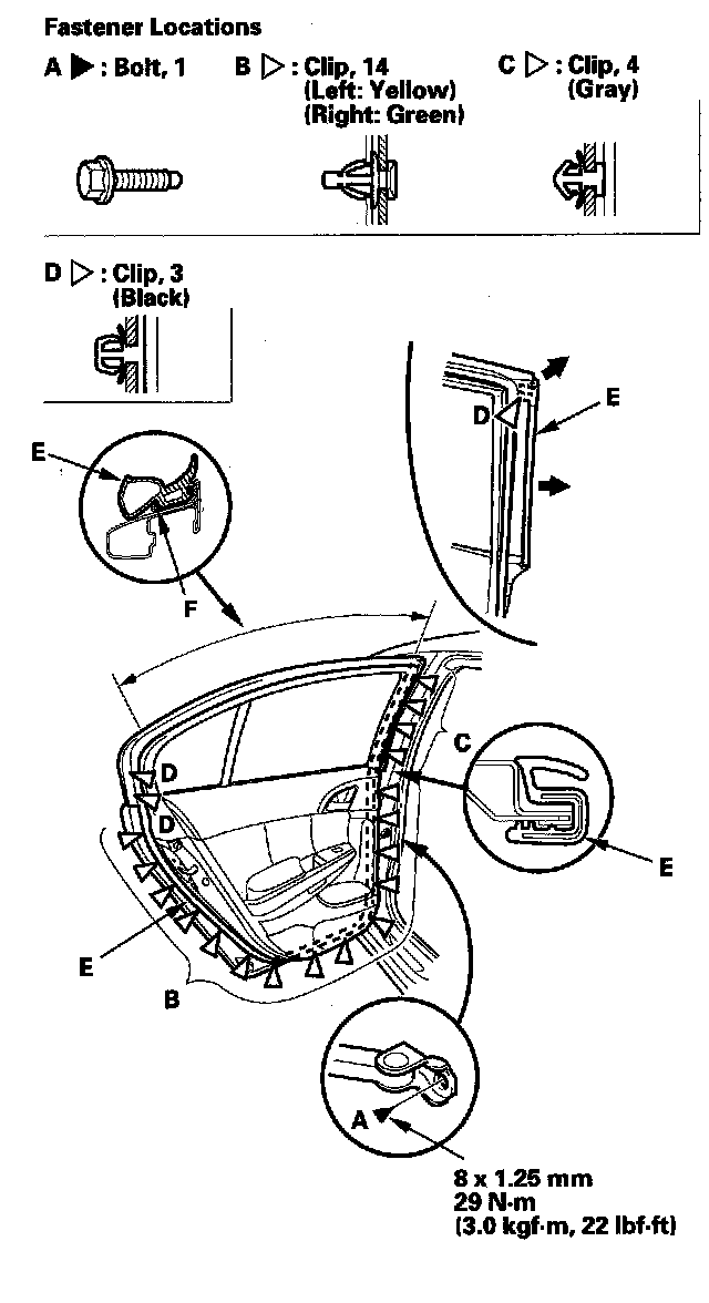 2. Detach the clips (B, C, D), and release the door weatherstrip (E) from the holder (F) of the door sash, then remove the weatherstrip.
