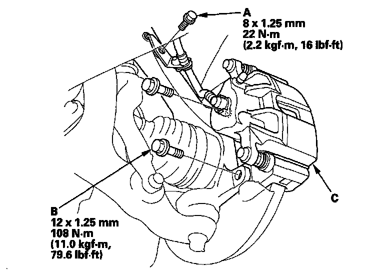 4. Remove the brake caliper bracket mounting bolts (B), then remove the caliper assembly (C) from the knuckle. To prevent damage to the caliper assembly or brake hose, use a short piece of wire to hang the caliper assembly from the undercarriage. Do not twist the brake hose excessively.