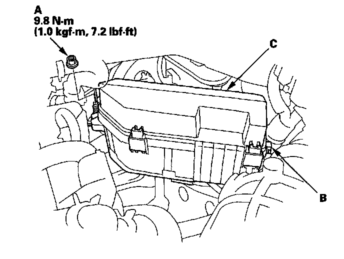 1. Remove the under-hood fuse/relay box mount nut (A) and release the clip (B), then move the underhood fuse/relay box (C) aside.
