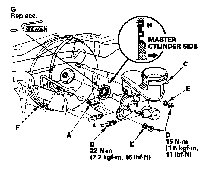 6. Remove the master cylinder from the brake booster (F). Be careful not to bend or damage the brake lines when removing the master cylinder.