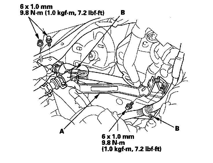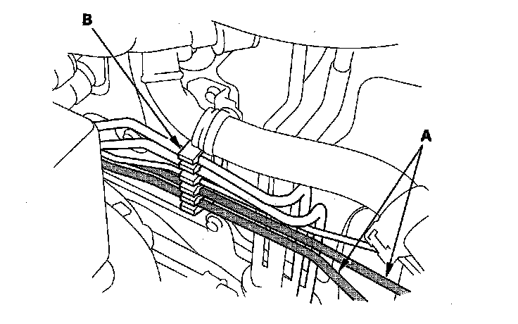 5. Remove the under-hood fuse/relay box bracket (A), then remove the engine wire harness clamps (B)