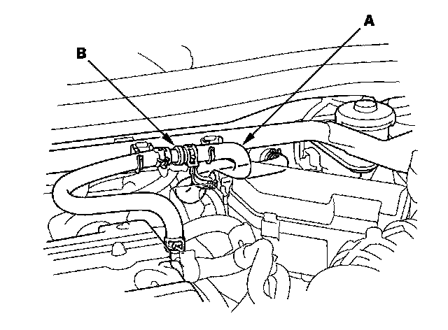 3. Disconnect the brake booster vacuum hose (A) at the booster. The check valve (B) is built into the hose.