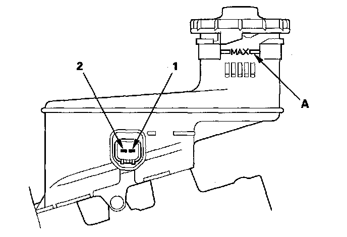 ^ Fill the reservoir with brake fluid to the MAX (upper) level (A). With the float up, there should be no continuity.